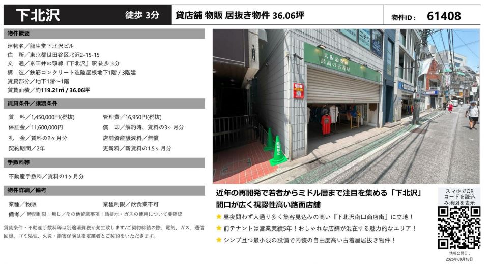 【下北沢 貸店舗】世田谷区北沢2-15-15                龍生堂下北沢ビル                 下北沢駅南口商店街に面する1階路面店舗・古着店舗居抜き 119.21㎡(36.06坪)